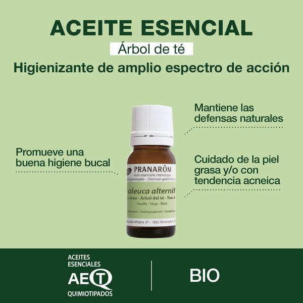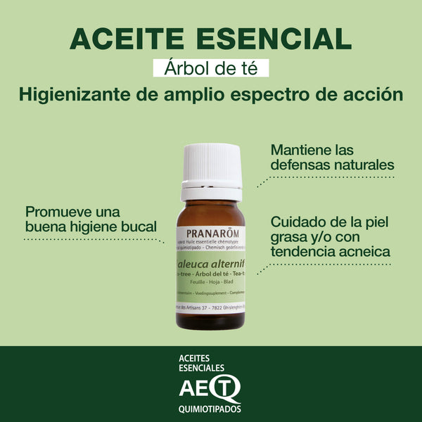 - El Aceite Esencial de Árbol del Té actúa contra las imperfecciones cutáneas y la higiene bucodental principalmente gracias a sus propiedades purificantes de amplio espectro. Este aceite es uno de los más versátiles del mundo de la aromaterapia.